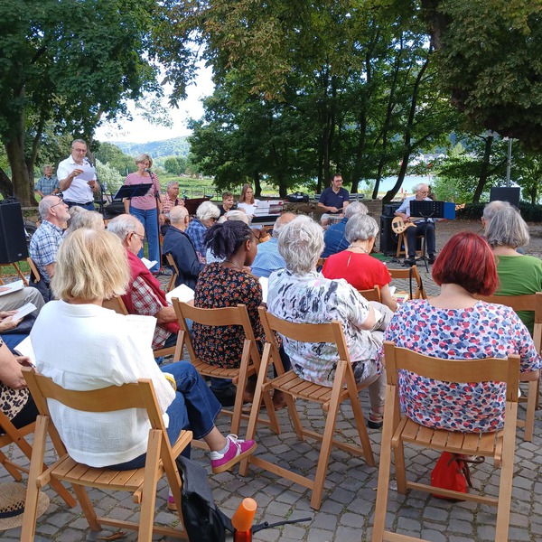 Letzte Sommerkirche 2025 vor der Johanniskirche in Lahnstein gestaltet von der Kolpingfamilie Lahnstein St. Martin und der Musikgruppe Jeton