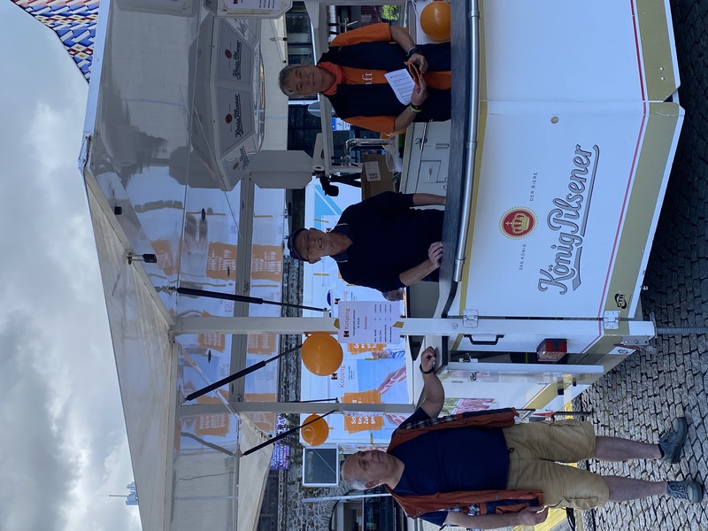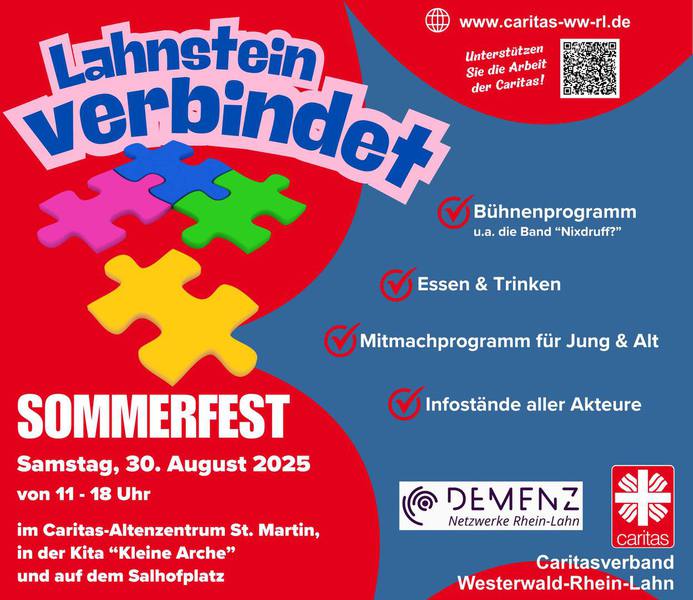 Die Kolpingfamilie St. Martin war mittendrin dabei beim Sommerfest des Caritasverbandes Rhein-Lahn-Westerwald unter dem Motto "Lahnstein verbindet". Auf dem Salhofplatz wurde ein Getränkestand betrieben. Das Fest ging von 11 bis 18 Uhr und wurde mit einem Gottesdienst mit dem Präses, Pfarrer Armin Sturm, gestartet. Dabei waren auch Instituionen und Gruppierungen der ehrenamtlichen Sozialarbeit, wie dem "Runden Tisch für Flüchtlinge - Willkommen in Lahnstein", dem Haus St. Christopherus in Lahnstein oder dem Netzwerk Demenz Rhein-Lahn. Gleichzeitig war es auch das Sommerfest der Kindertagesstätte "Kleine Arche" sowie des Altenzentrums St. Martin. Das Fest bei wirklich hochsommerlichen Temperaturen hätte mehr Besucher verdient gehabt. Lag wohl an der spärlichen Vorab-Werbung in der örtlichen Presse durch den Veranstalter. Zum Abschluß trat auf der LKW-Bühne eine Band ehemaliger Obdachloser aus Limburg auf. Die Formation "Nixdruff", die Band des Walter-Adloch-Hauses Limburg, begeisterte das Publikum mit Rock und Pop-Klassikern, u.a. von den Eagles oder auch mit Deep Purples "Child in Time", gesungen von einer guten Sängerin.