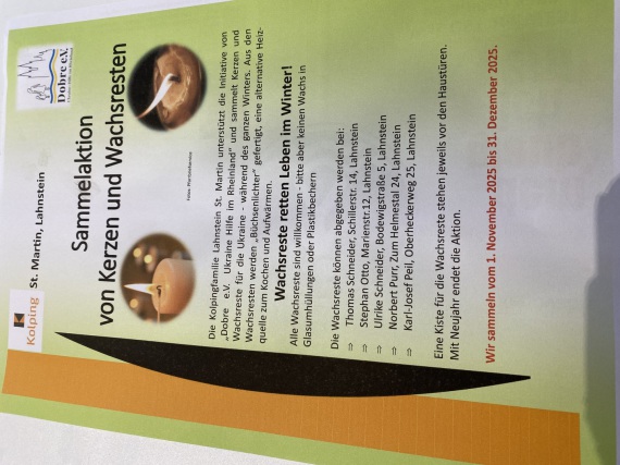 Hinsichtlich der Sammlung von Kerzenwachs und Kerzenstumpfen zur Herstellung sogenanntet Büchsenlichter in der Ukraine gibt es bei der Kolpingfamilie St. Martin eine Zwischenbilanz. Es wurden bisher 625 Kilogramm Wachs gesammelt. In 25 Bananenkisten verpackt geht der Wachs demnächst in die Ukraine. Die Büchsenlichter bieten eine Licht- und Heizalternative bedingt durch viele kriegsbedingte Stromausfälle. Die Sammlung erfolgt gemeinsam mit dem Verein "Do Vira- Help Foudation e.V.", mit Sitz in Köln. Wachs und Kerzen - jedoch keine Teelichter oder Glas- und Porzellan umrandeten Kerzen - können noch bis zum 31. Januar 2025 abgegeben werden bei Ulrike Schneider (Bodewigstraße 5, Oberlahnstein), Karl-Josef Peil (Oberheckerweg 25, Oberlahnstein) und Thomas Schneider (Schillerstraße 14, Niederlahnstein).