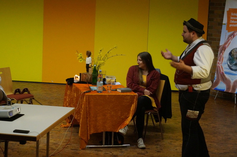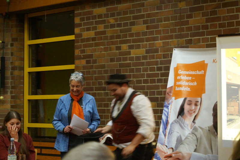 Kolping-Vorsitzender Markus Schild überreichte ein Weinpräsent und lud zum nächsten Kolping-Kirchenbabarettabend am 18. April 2020, dann im Jugendkulturzentrum mit Heri Lehnert und anderen, ein. Das Kirchenkabarett wird dann als Benefizveranstaltung zugunsten eines Projektes im Internationalen Kolpingwerk durchgeführt.