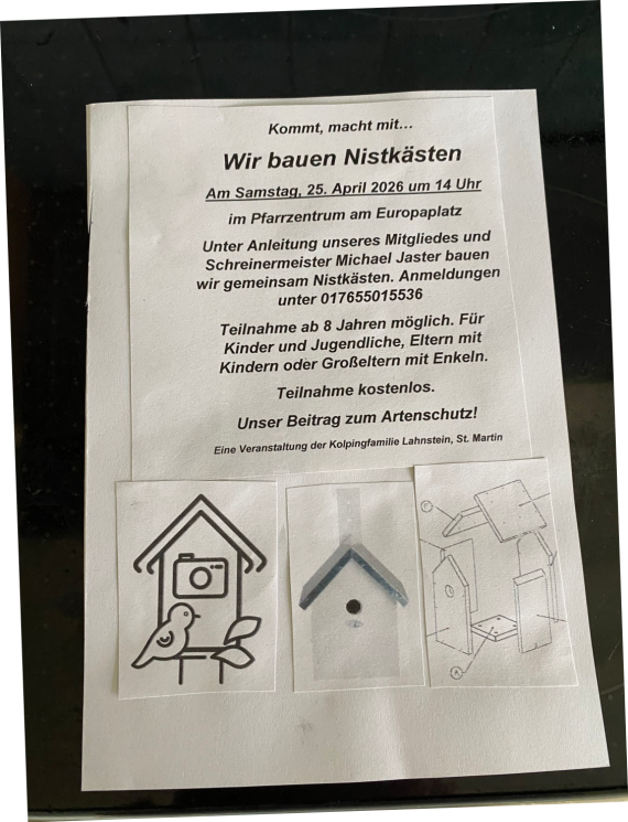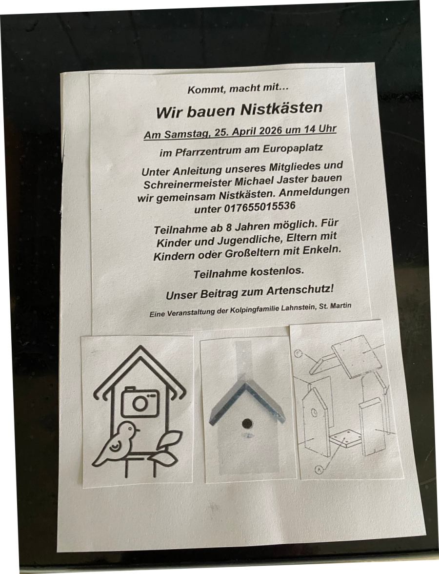 Lahnstein. Natürliche Brutstätten zu finden wird für Vögel immer schwieriger. In aufgeräumten Gärten und an den geschlossenen Fassaden moderner Häuser gibt es kaum mehr geeignete Plätze für die Aufzucht ihrer Jungen. Mit dem Anbringen von Nistkästen kann man den gefiederten Freunden helfen und verschiedenste Vogelarten in den heimischen Garten locken. Die Kolpingfamilie St. Martin will sich aktiv für den Artenschutz einsetzen und lädt zum Bau von Nistkästen ein. Eine Aktion für jung und alt, für Kinder, für Eltern mit ihren Sprösslingen sowie für Opas und Omas mit ihren Enkeln. Am Werk sind die kleinen und großen Handwerker unter der fachkundigen Anleitung des Kolping-Vorstandsmitgliedes und Schreinermeisters Michael Jaster am Samstag, 25. April 2026 ab 14 Uhr im Pfarrzentrum am Europaplatz. Die Materialien werden von der Kolpingfamilie gestellt. Die Kolpingfamilie lädt erstmals und bisher einmalig zu diesem generationsübergreifenden Format ein. Die selbst gebauten Nistkästen können mit nach Hause genommen werden, als kleiner Beitrag zum Naturschutz, der direkt sichtbar wird. Mitmachen können Kinder ab fünf Jahren in Begleitung von Erziehungsberechtigten und Kinder ab acht Jahren auch alleine. Unbedingt erforderlich ist eine Voranmeldung unter der Telefonnummer 017655015536.